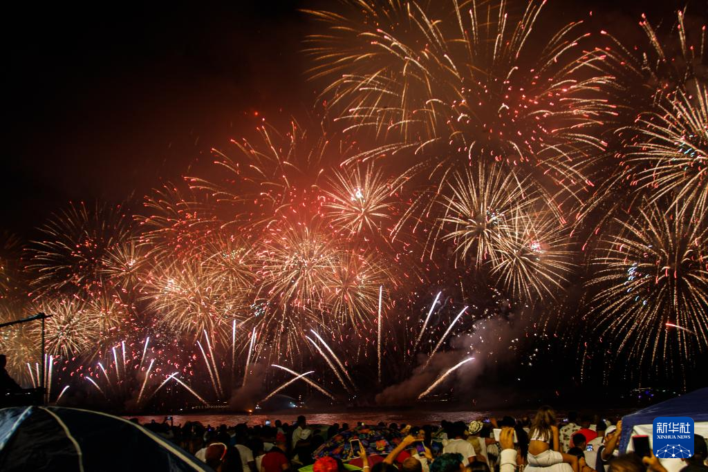 2024年1月1日凌晨,在巴西里約熱內(nèi)盧科帕卡巴納海灘,人們觀看焰火表演迎新年。
