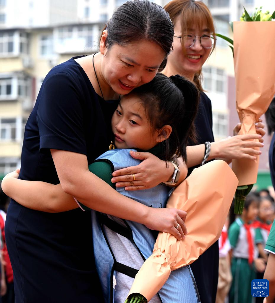 9月10日,在河北石家莊市明珠花苑小學(xué),學(xué)生擁抱老師。