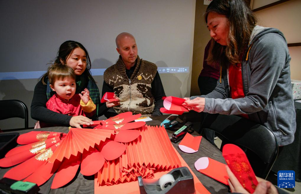 1月18日,人們?cè)诩幽么鬁馗缛A舉行的中國春節(jié)文化體驗(yàn)活動(dòng)上學(xué)習(xí)制作春節(jié)裝飾品。