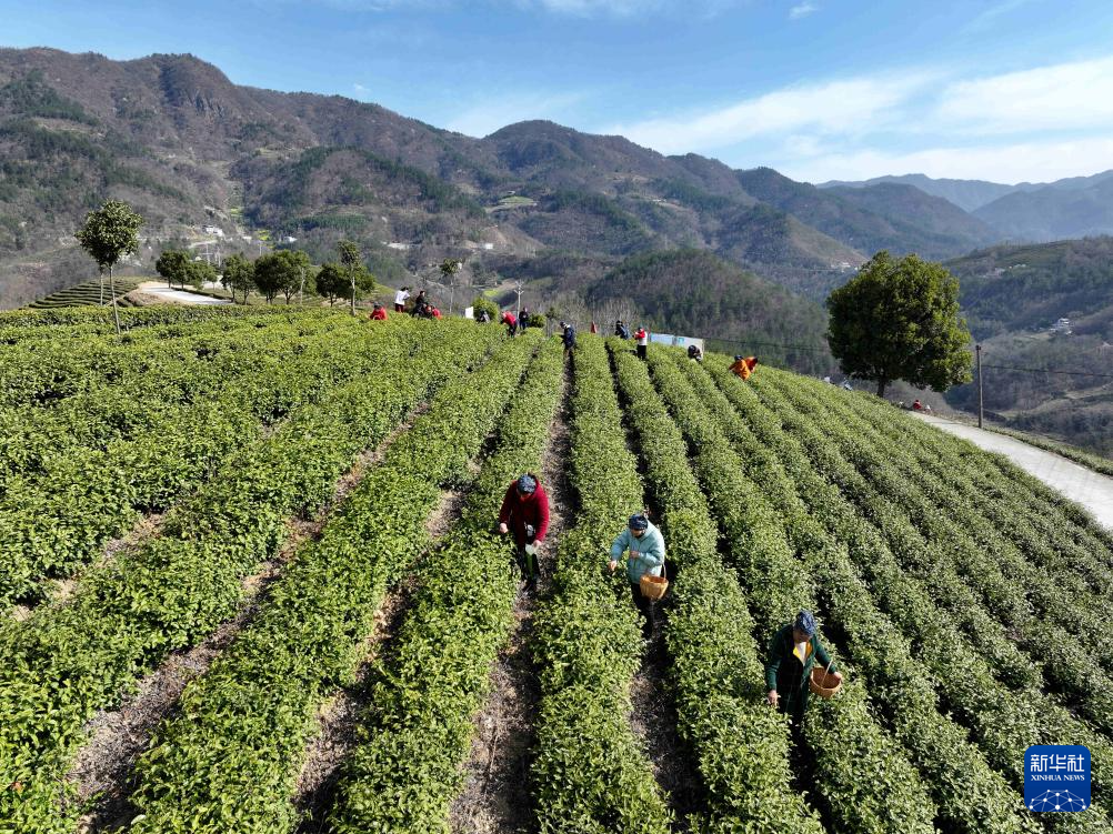 3月18日,湖北省宜昌市秭歸縣茅坪鎮(zhèn)松樹坳村村民在茶園采摘新茶(無人機照片)。