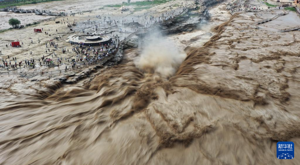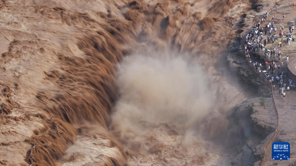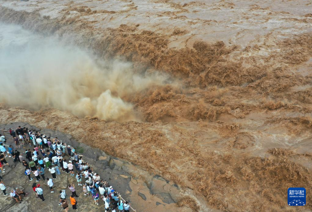 7月27日,人們在山西吉縣觀看黃河壺口瀑布(無人機照片)。