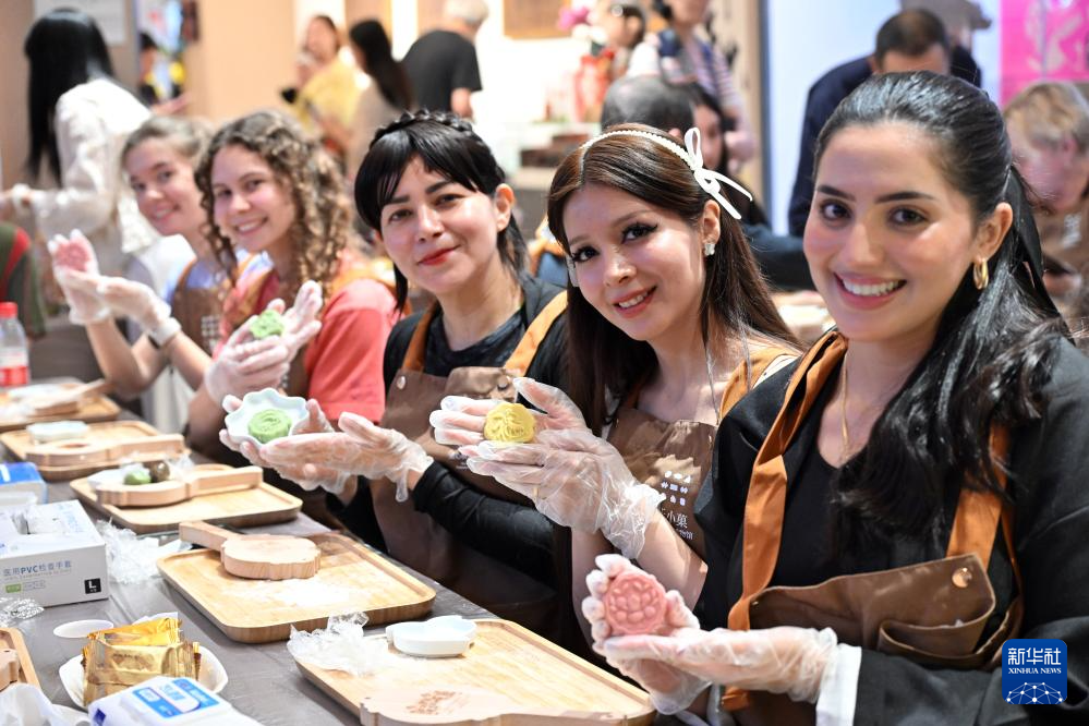 9月29日,在北京市朝陽區(qū)于小菓點(diǎn)心模具博物館,中外青年展示自己制作的月餅。