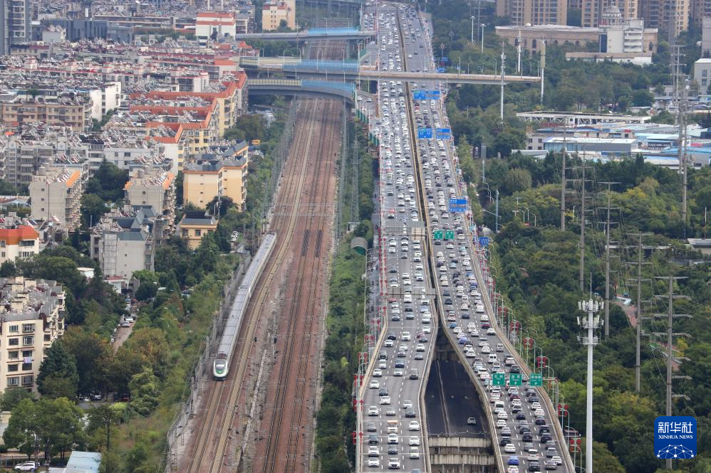 10月7日,車輛行駛在江蘇省南京市應(yīng)天高架上(無人機(jī)照片)。