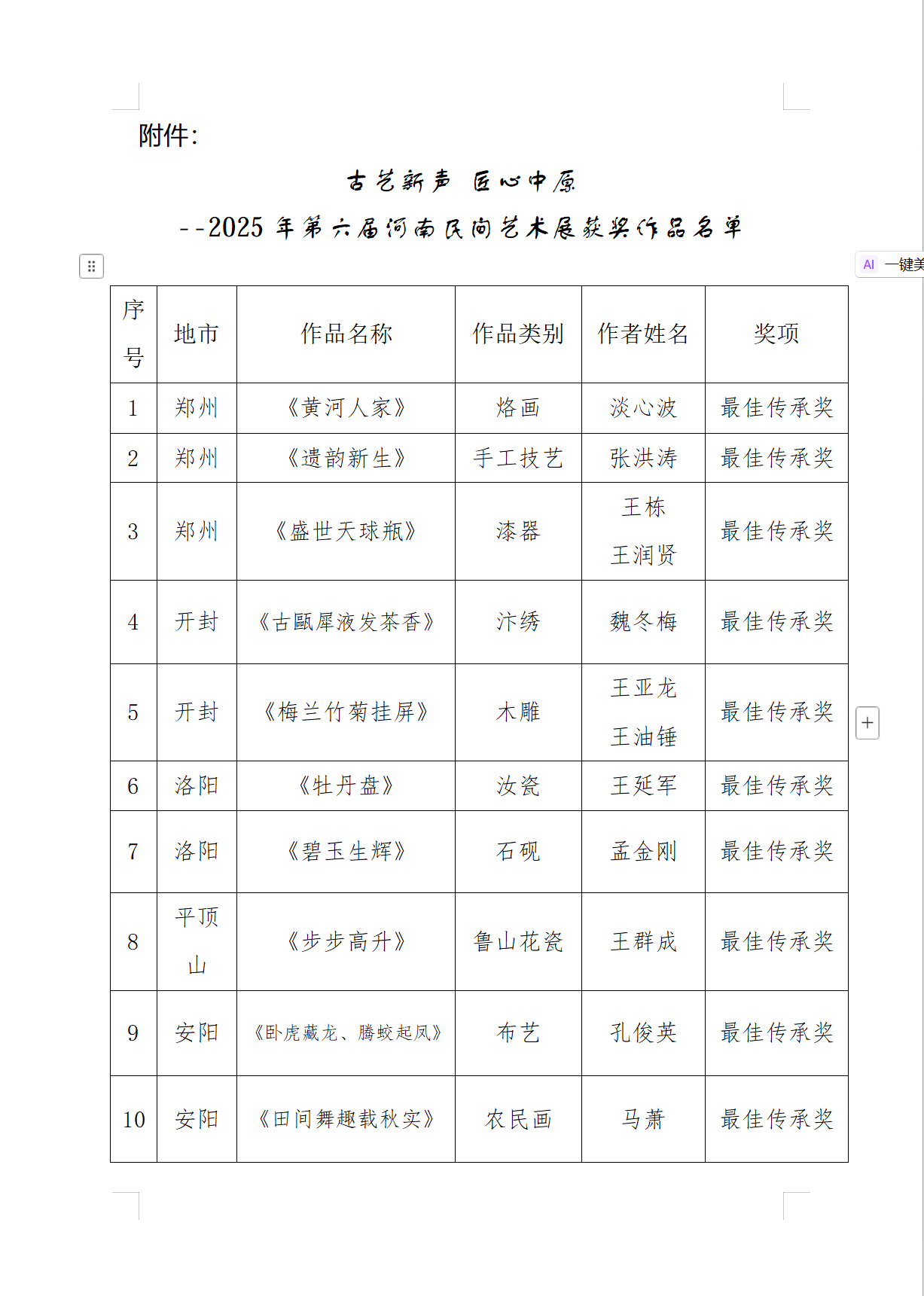 據悉,根據 2025 河南惠民文化活動總體安排,河南文化館組織開展的第六屆河南民間藝術展作品征集工作,經全省縣、市各級推薦,共收到作品 30 類 1500 余件。經專家評審,共評出最佳傳承獎20 個,優(yōu)秀獎40 個,別具匠心獎60 個,榮譽參展獎20 個。(漯河市廣播電視臺網絡部記者:柴全偉)